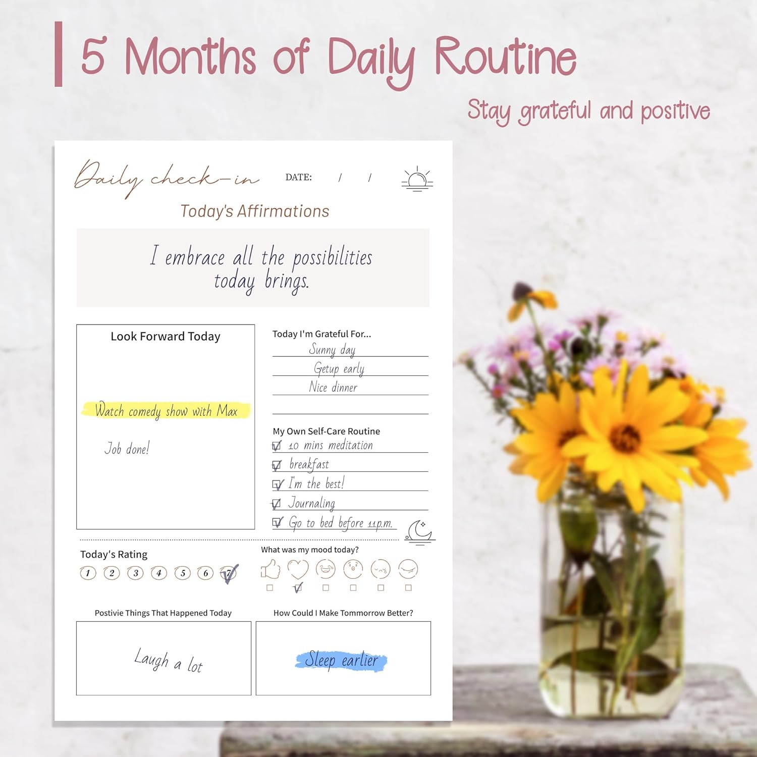 Morning and Night Ritual: Kick off your mornings in just 5 minutes and wind down your nights with another 5-minute reflection. It's a simple routine that sets you up for success and helps you relax into a peaceful slumber.