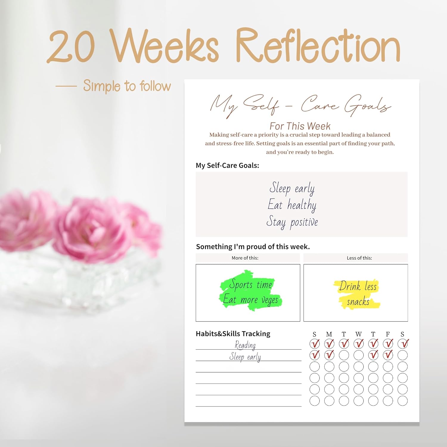 20 Weeks of Self-Discovery: Dive into a journey of self-love and introspection with our 20-week journal. It includes daily and weekly reflections, stress relief pages, and more, spanning a total of 192 pages. Complete it and you'll have a treasure trove of memories and insights.