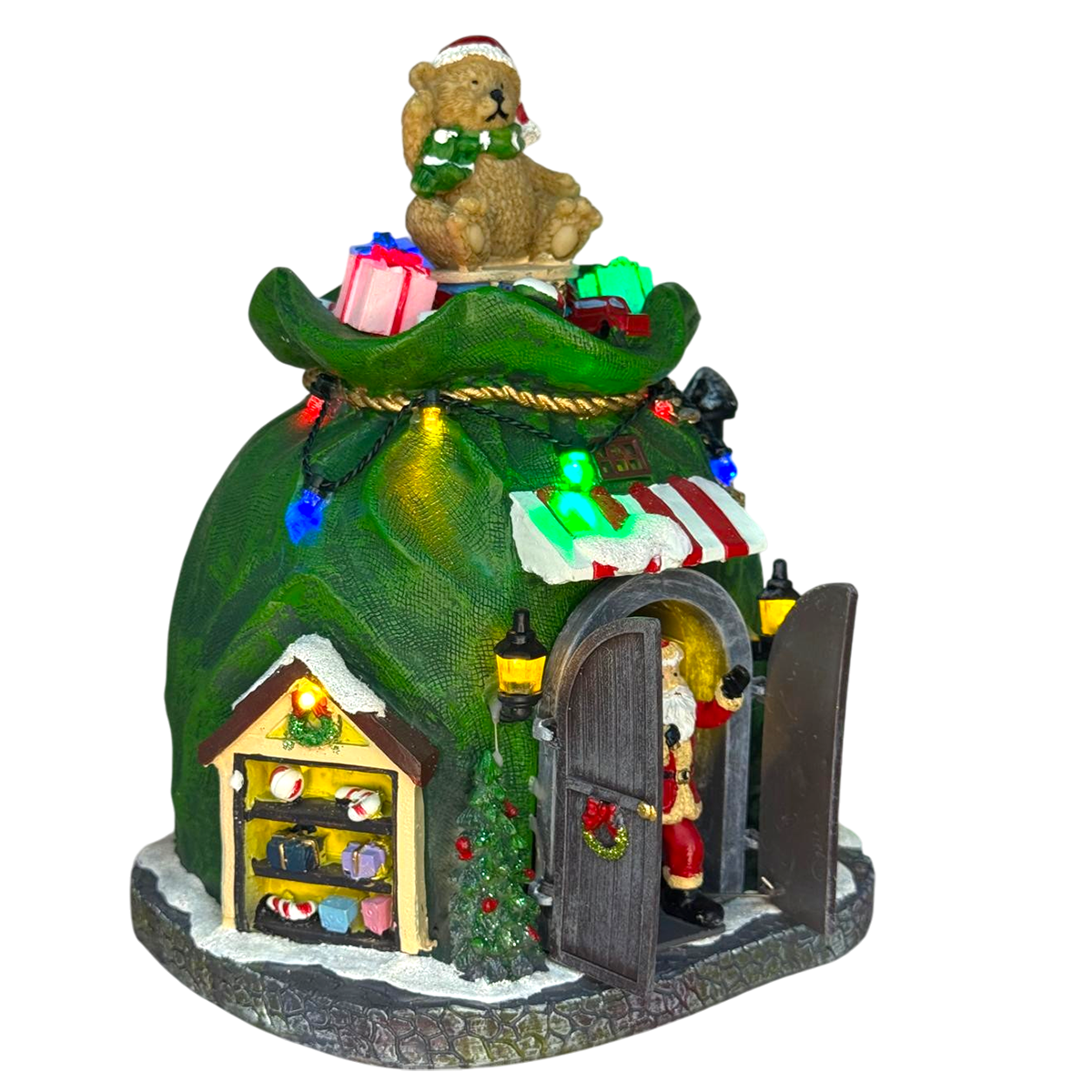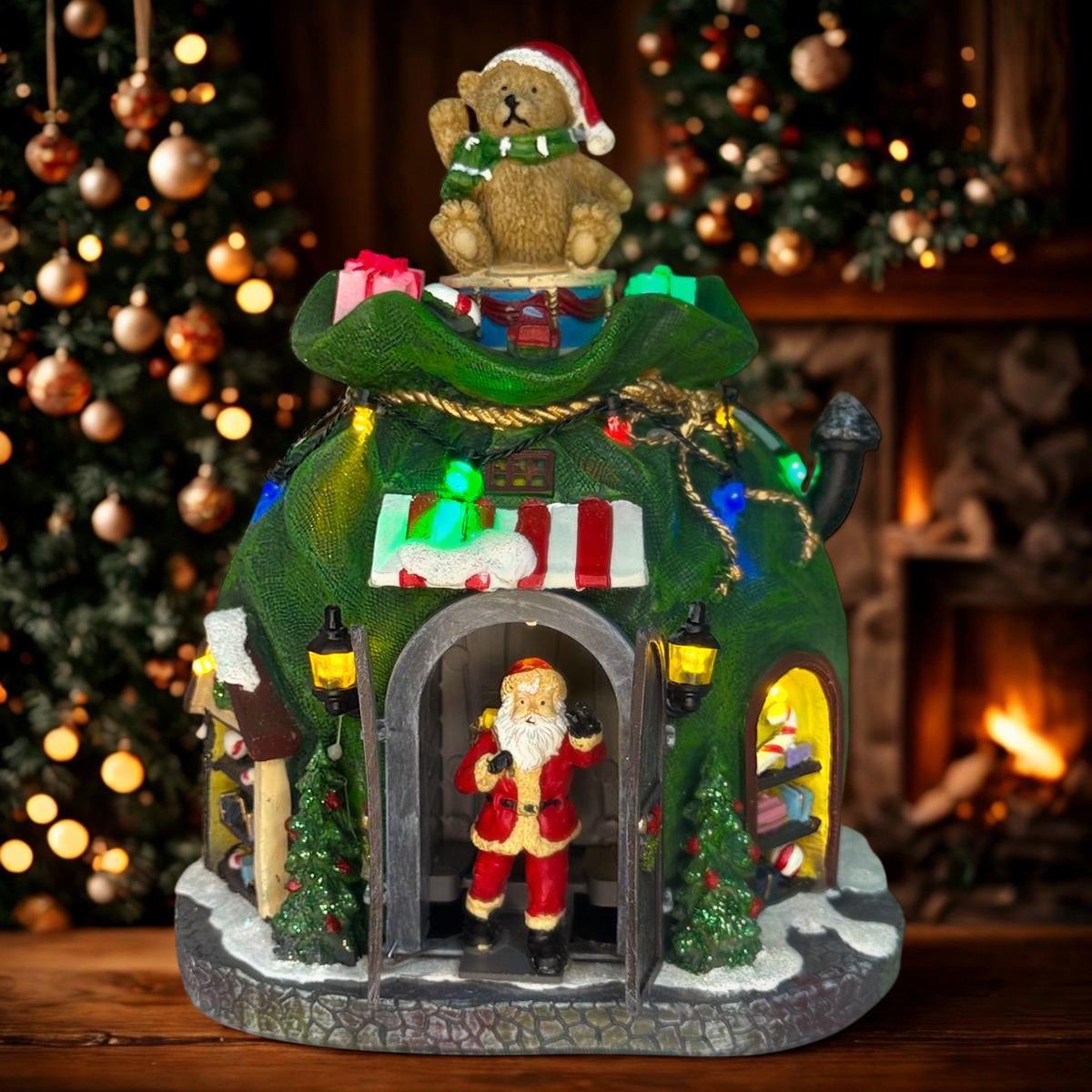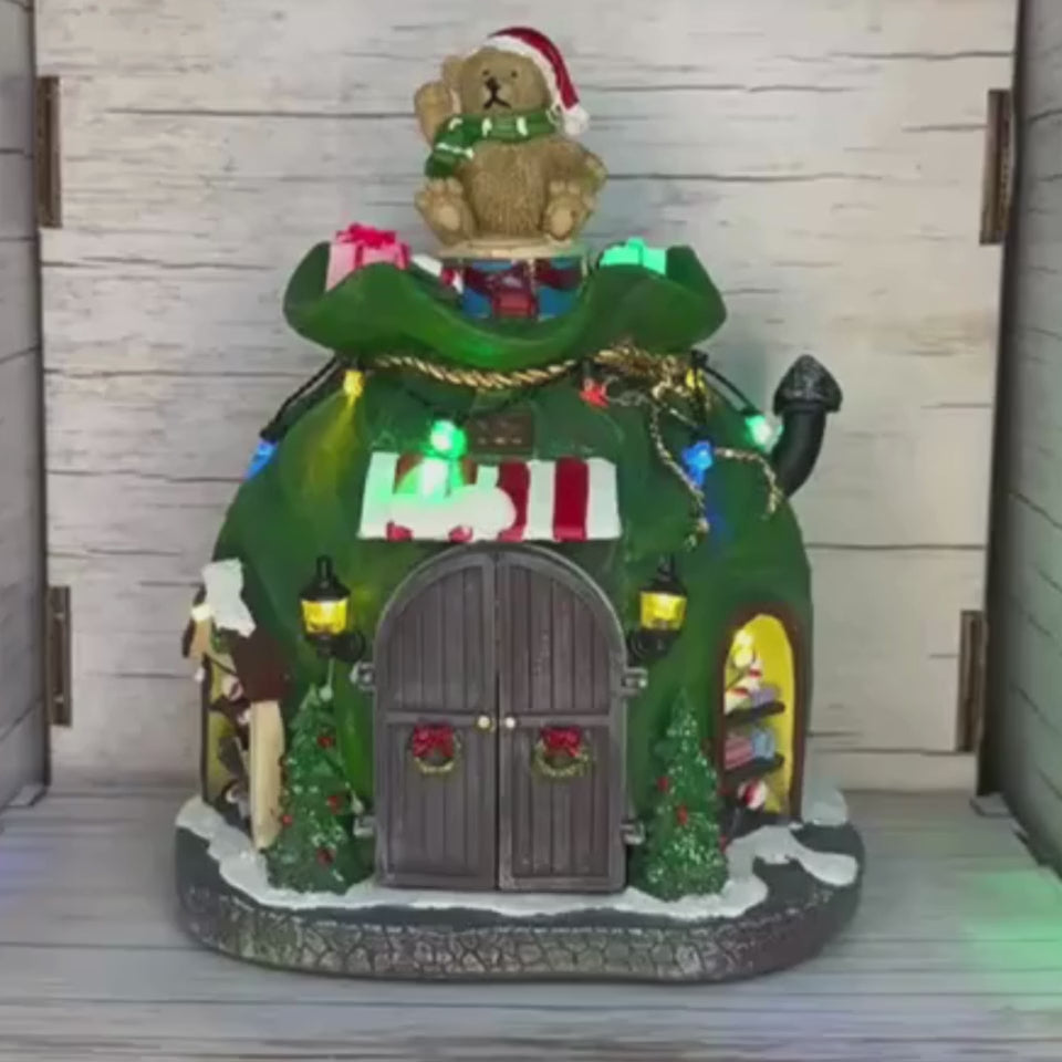 Watch the enchantment unfold! The charming, snow-capped gift shop comes alive as its tiny door suddenly swings open. Out pops Santa Claus himself in a joyful animated motion, to greet the world before ducking back inside to his workshop.