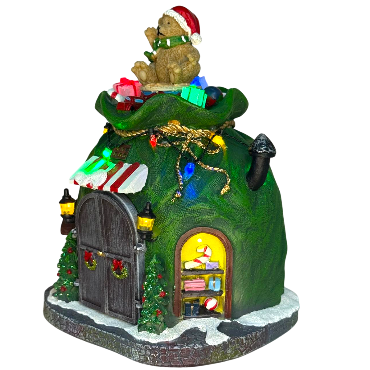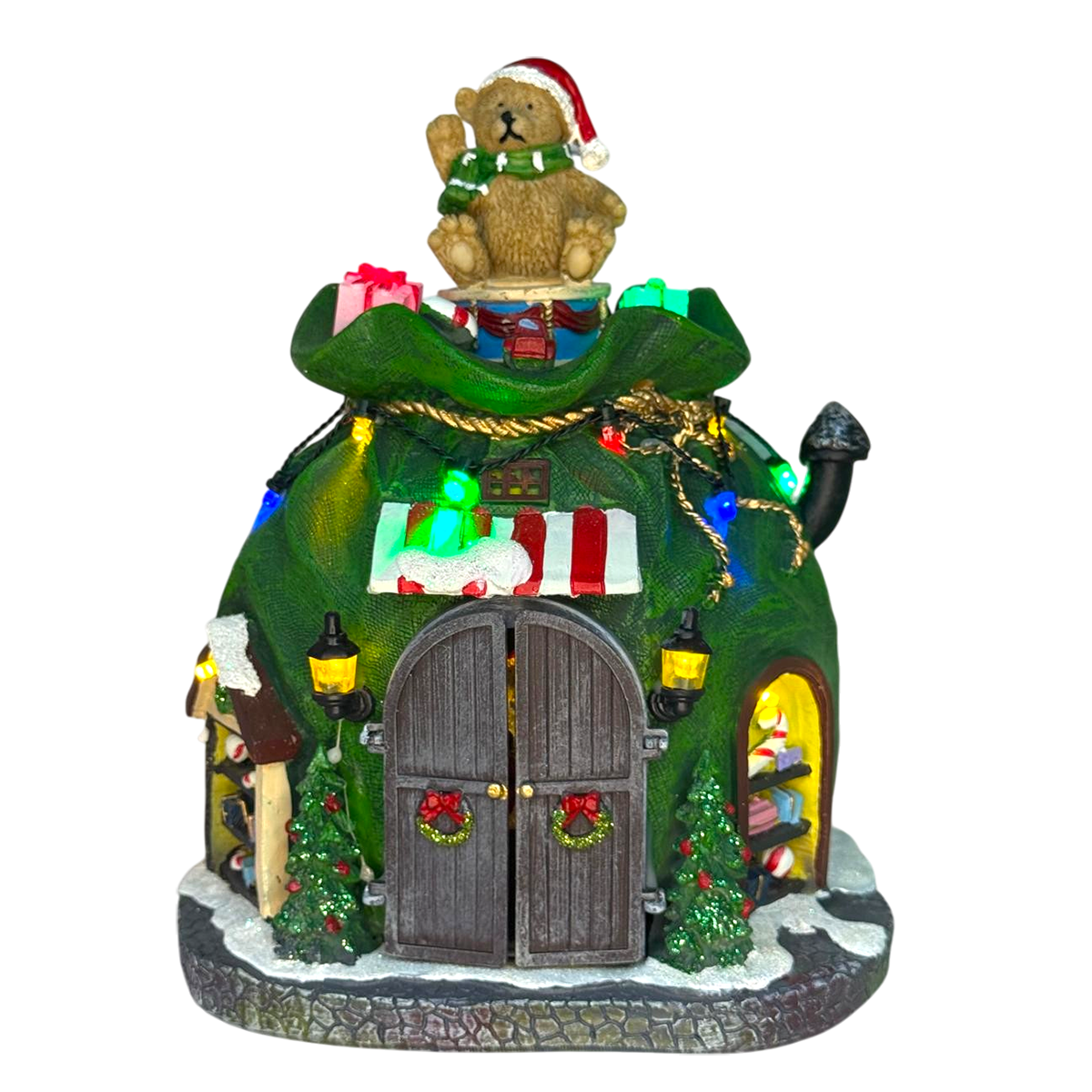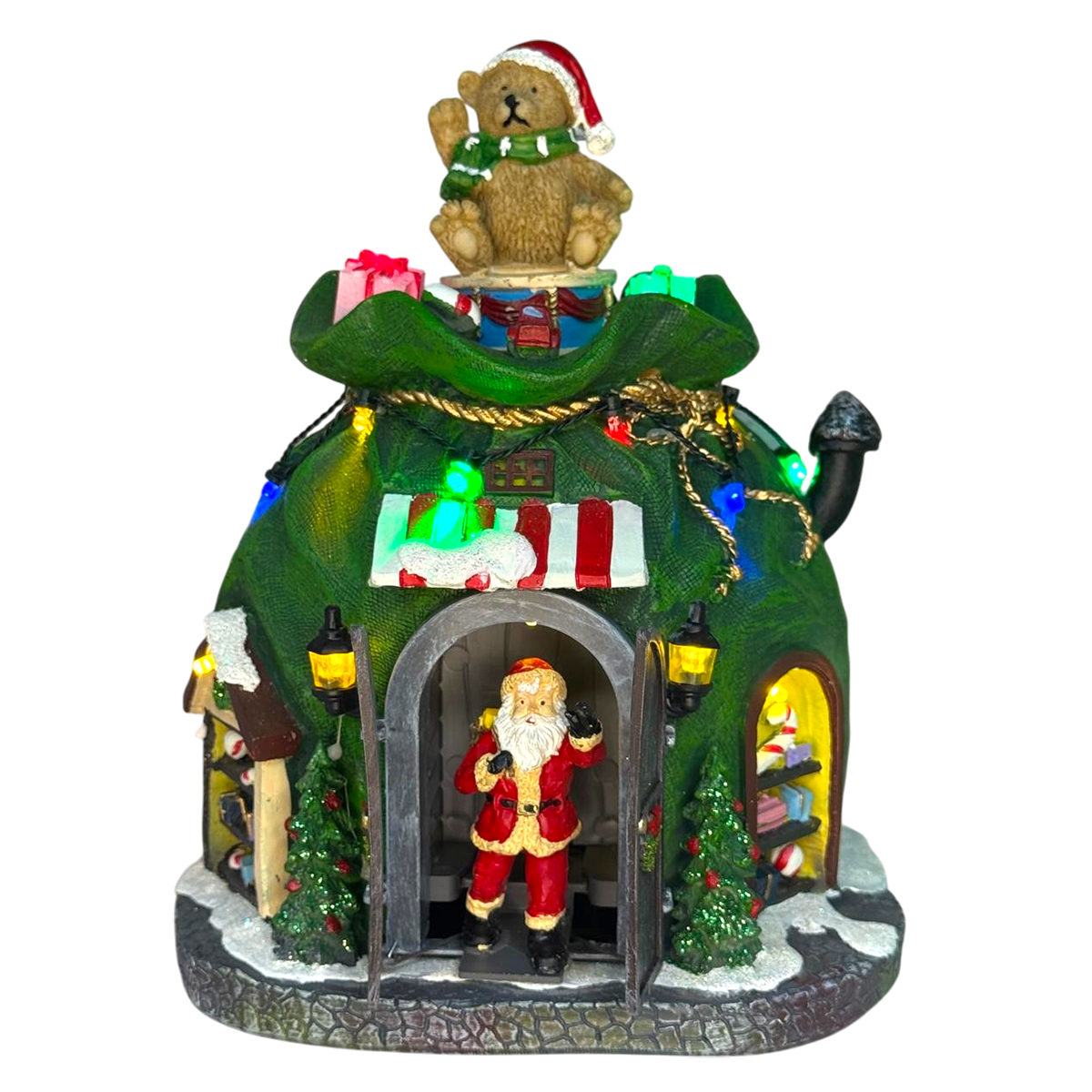 Watch the enchantment unfold! The charming, snow-capped gift shop comes alive as its tiny door suddenly swings open. Out pops Santa Claus himself in a joyful animated motion, to greet the world before ducking back inside to his workshop.